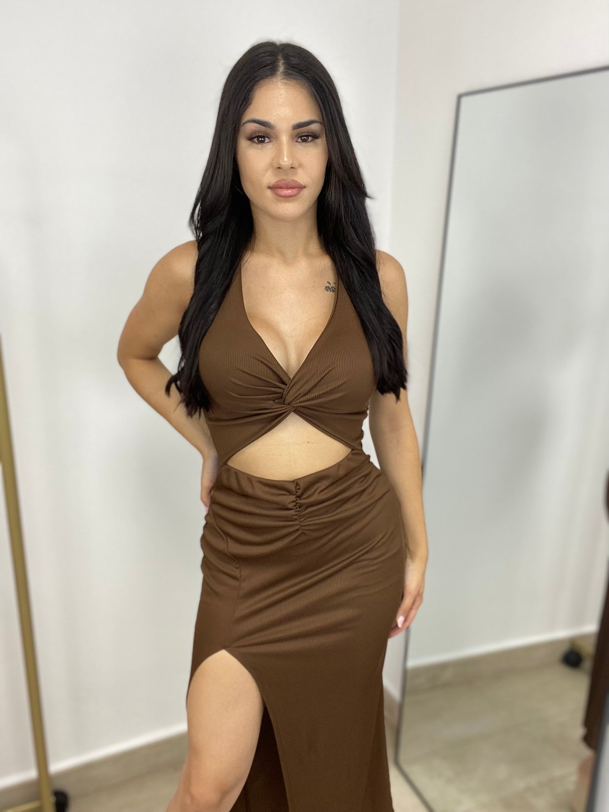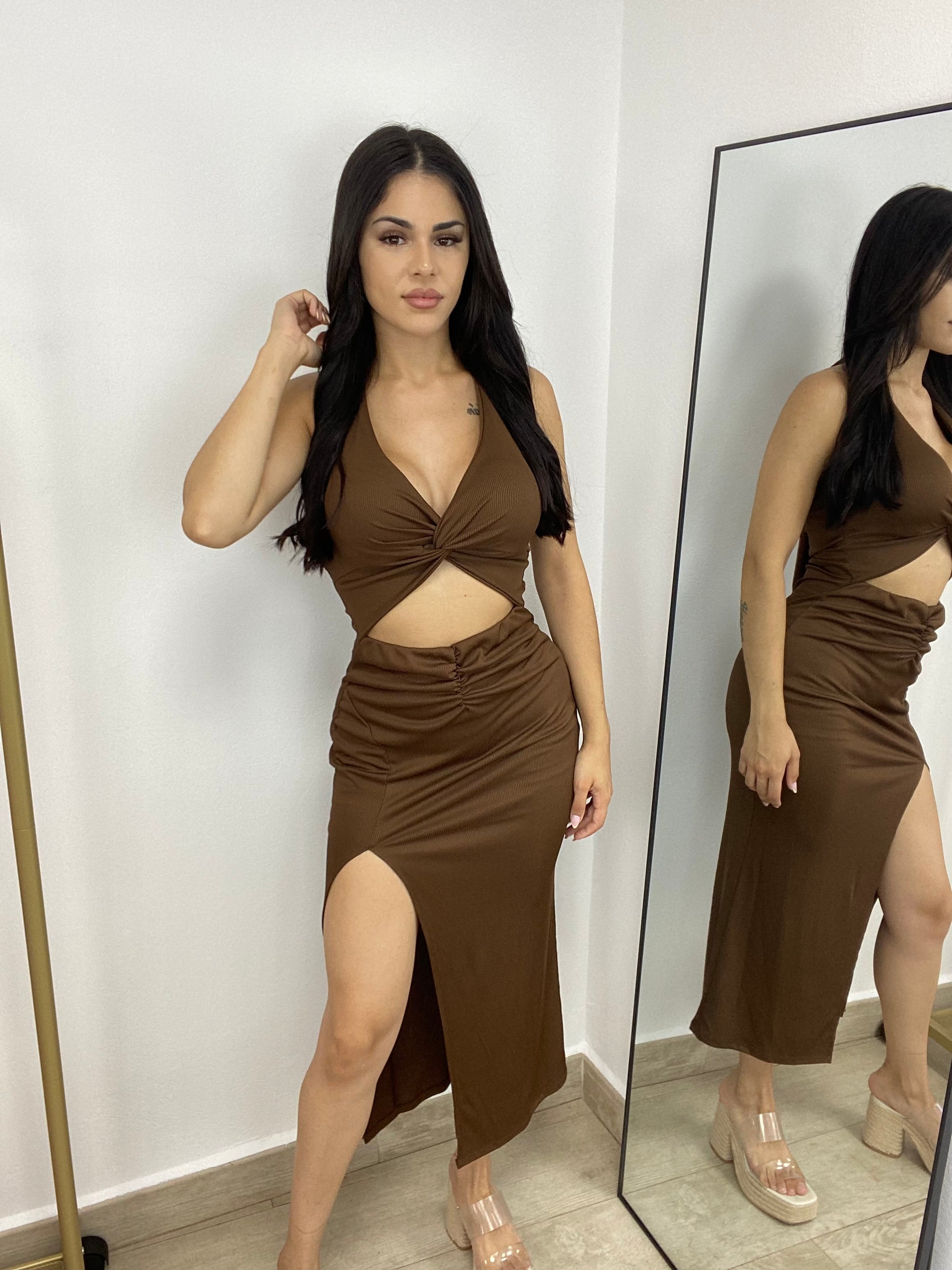 Vestido canalé abertura marrón